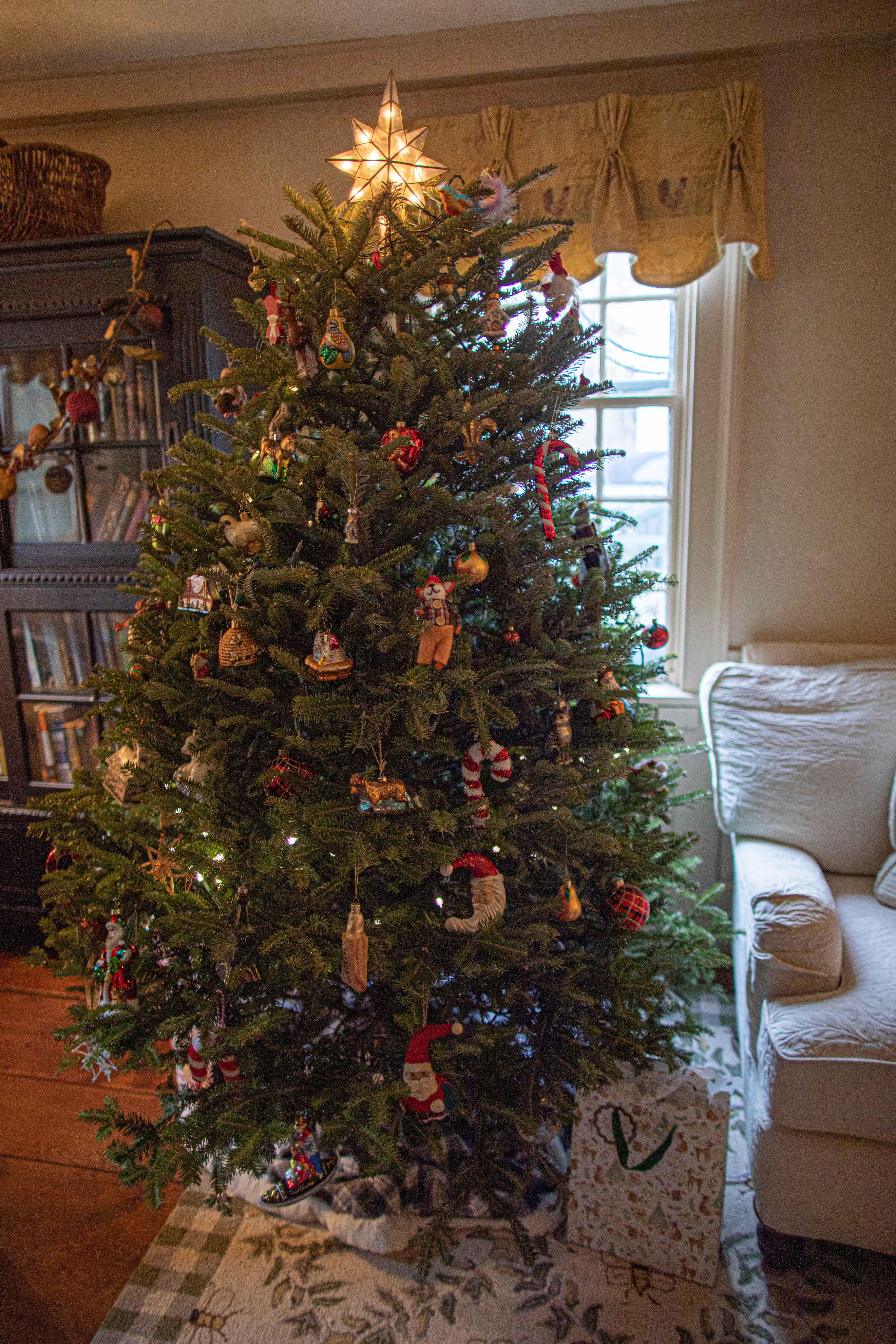 Keeping with the chicken and bee theme, this tree had chicken and beekeeper decorations (zoom in and look about 1/3 of the way from the top on the left)’