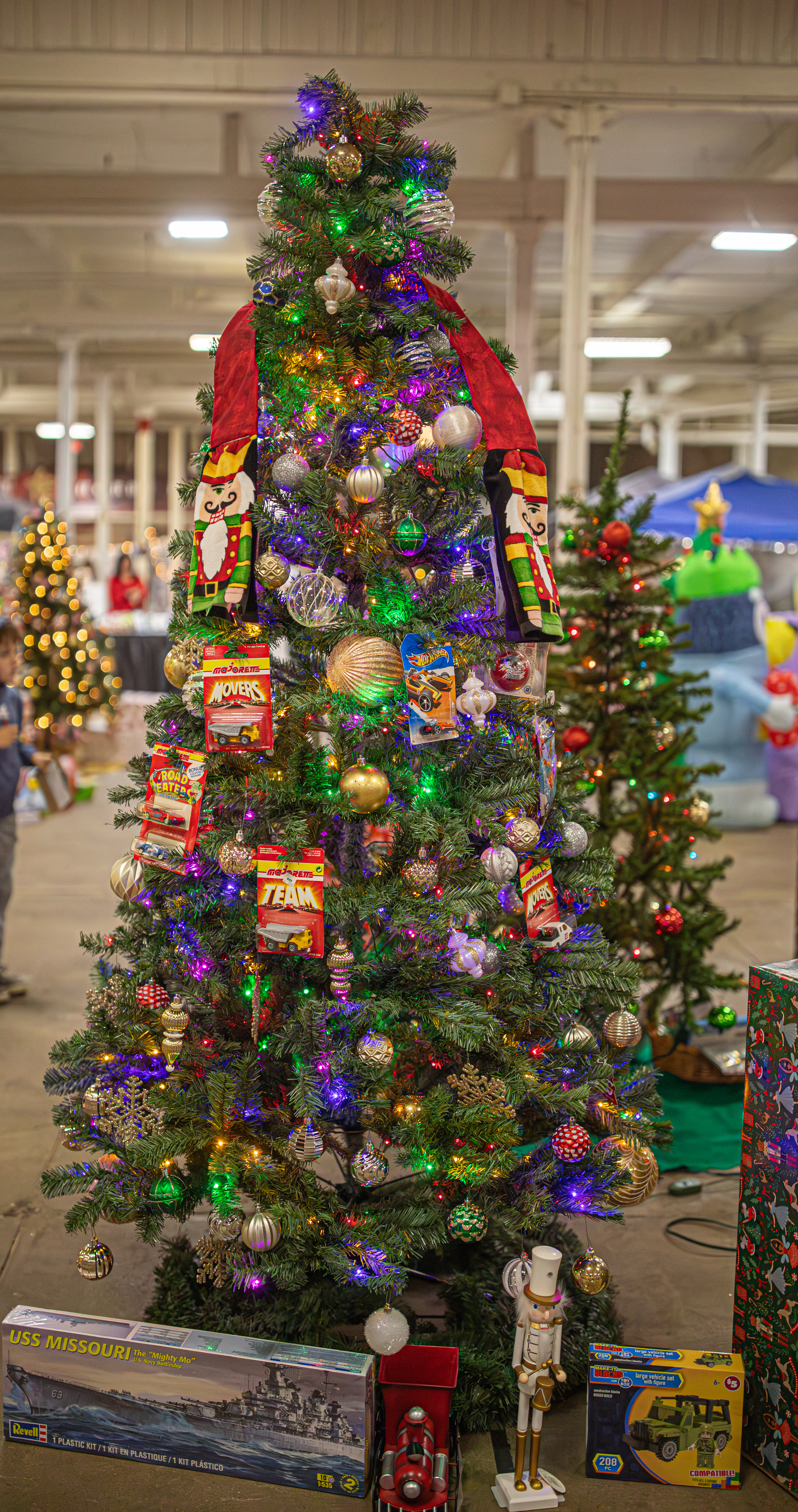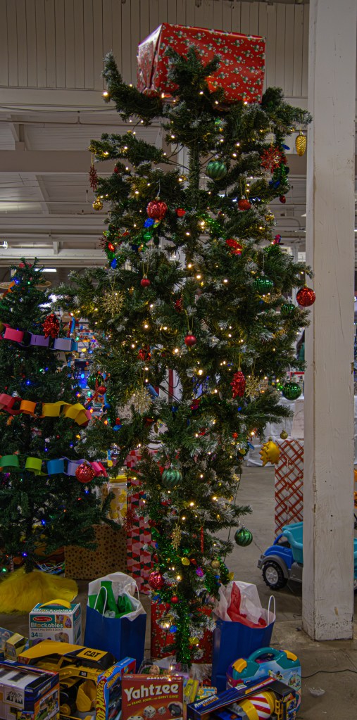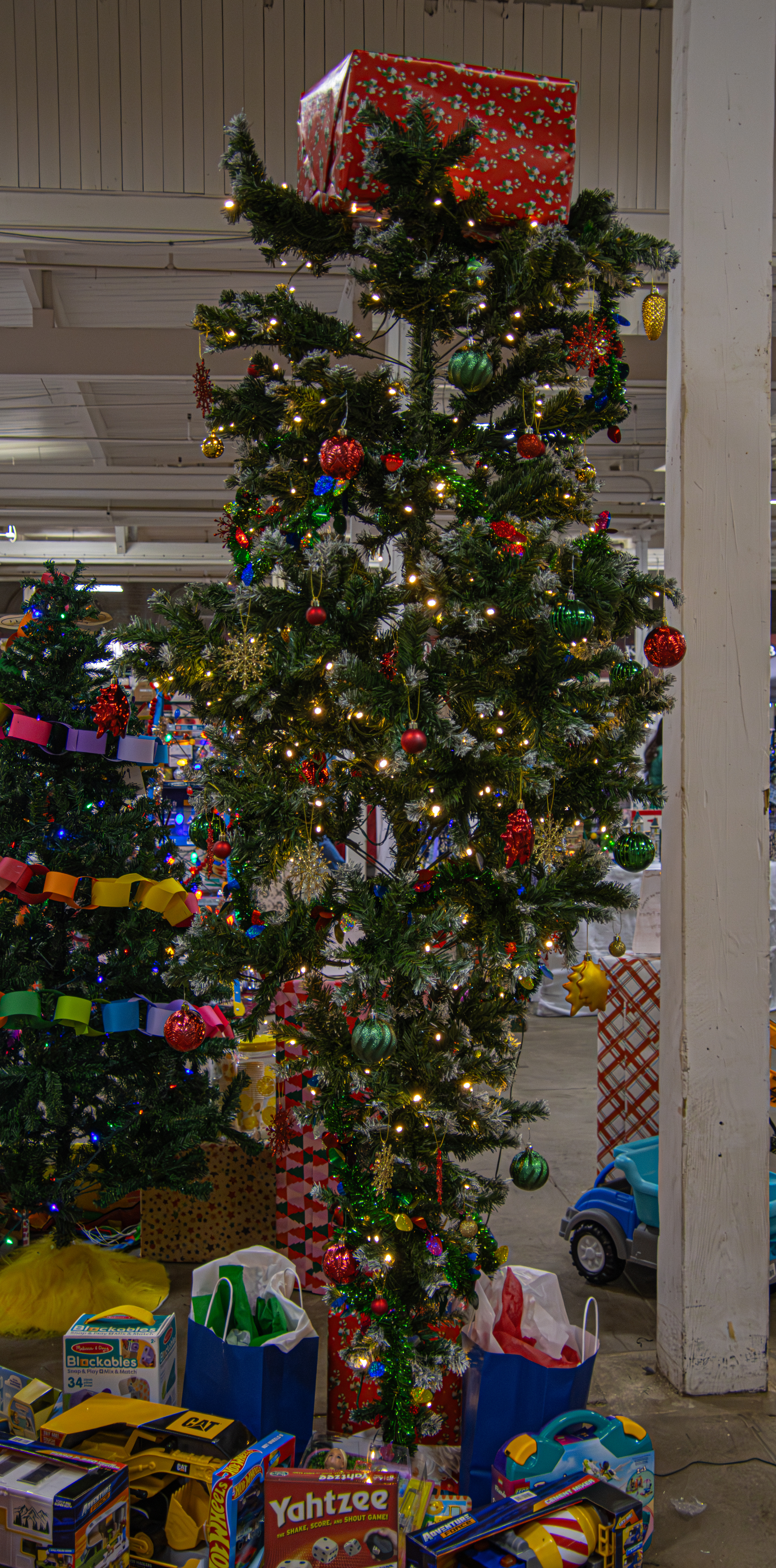 This tree, and “upside down Christmas Tree” had toy trucks and games under (or above?) it.