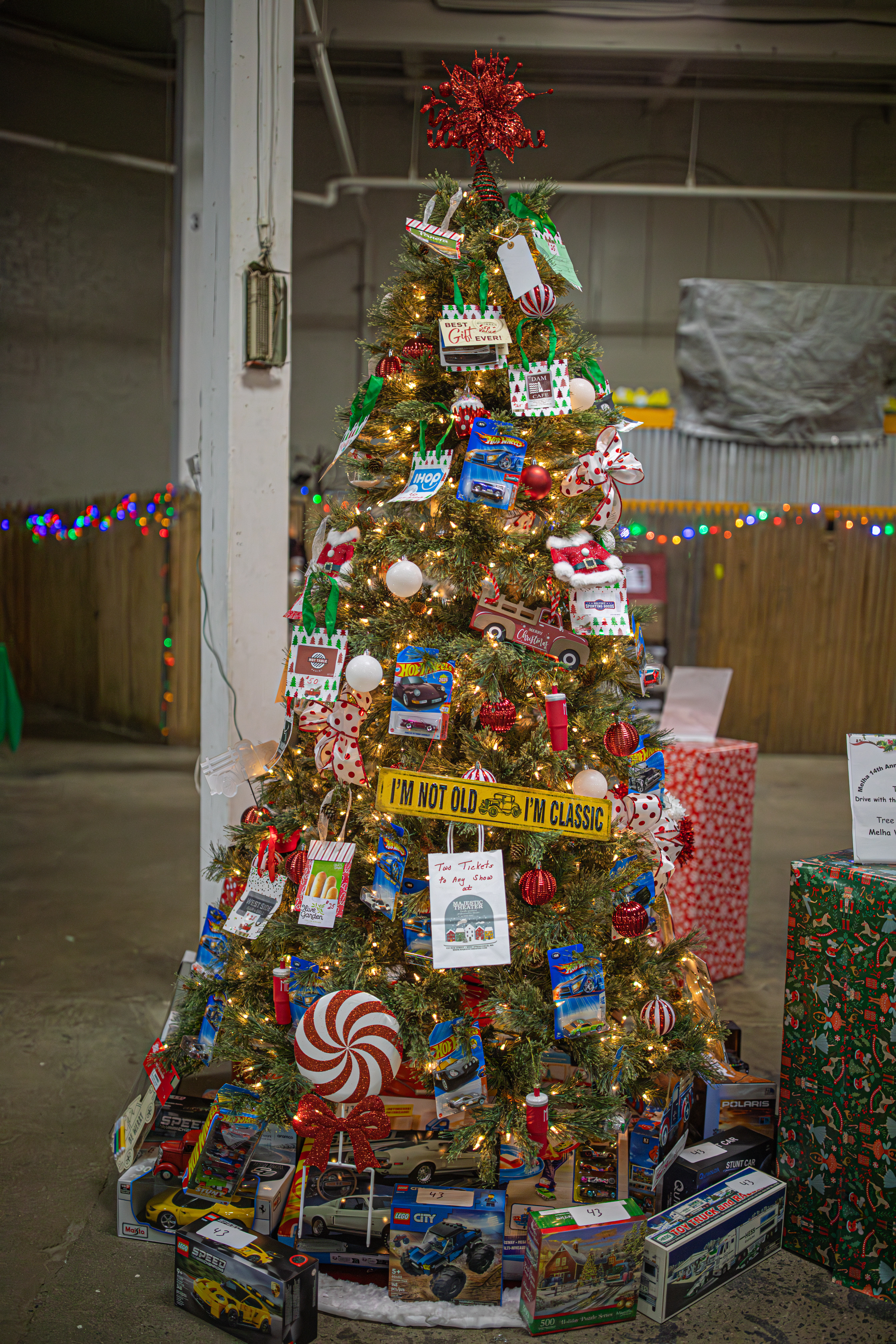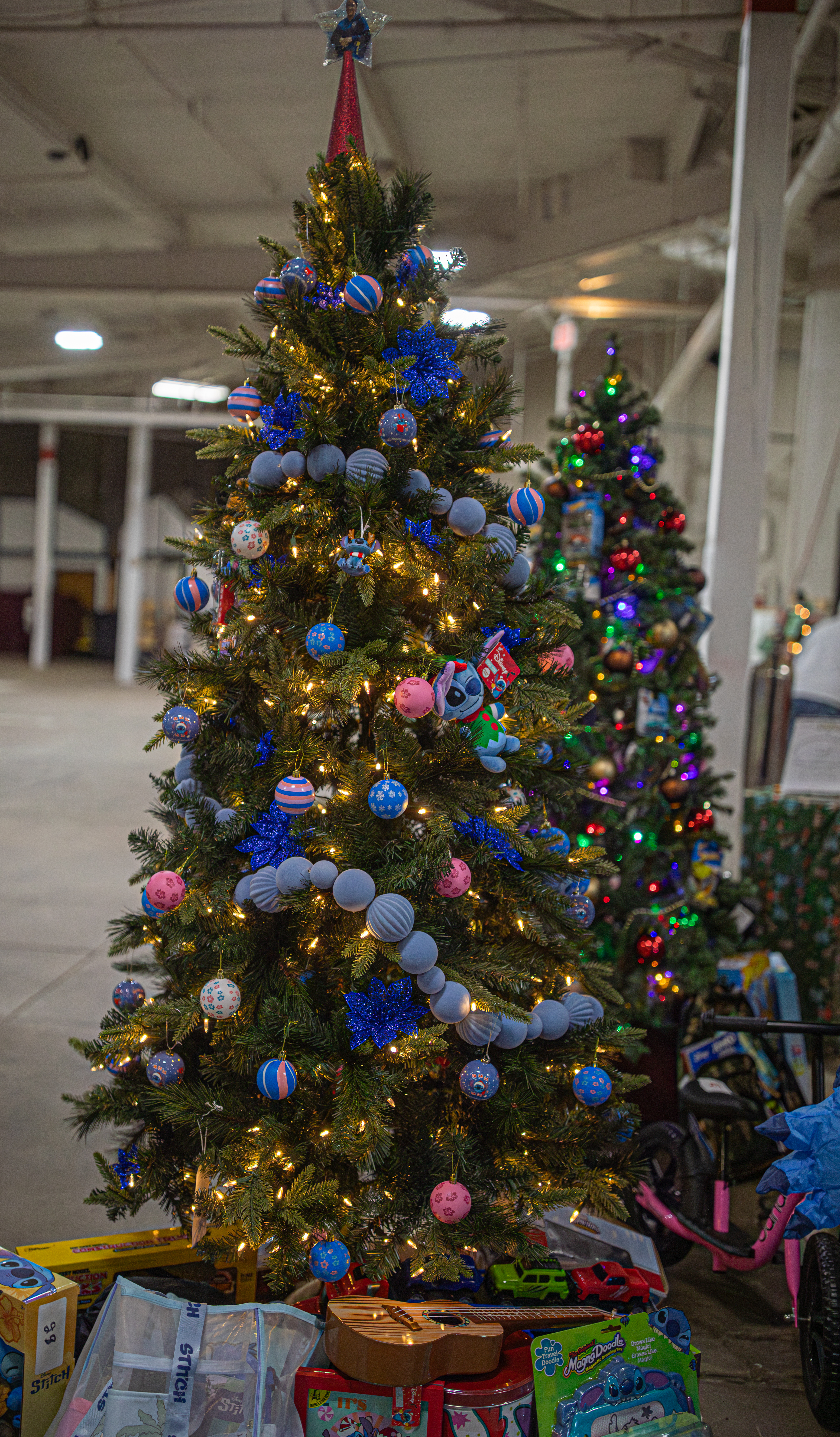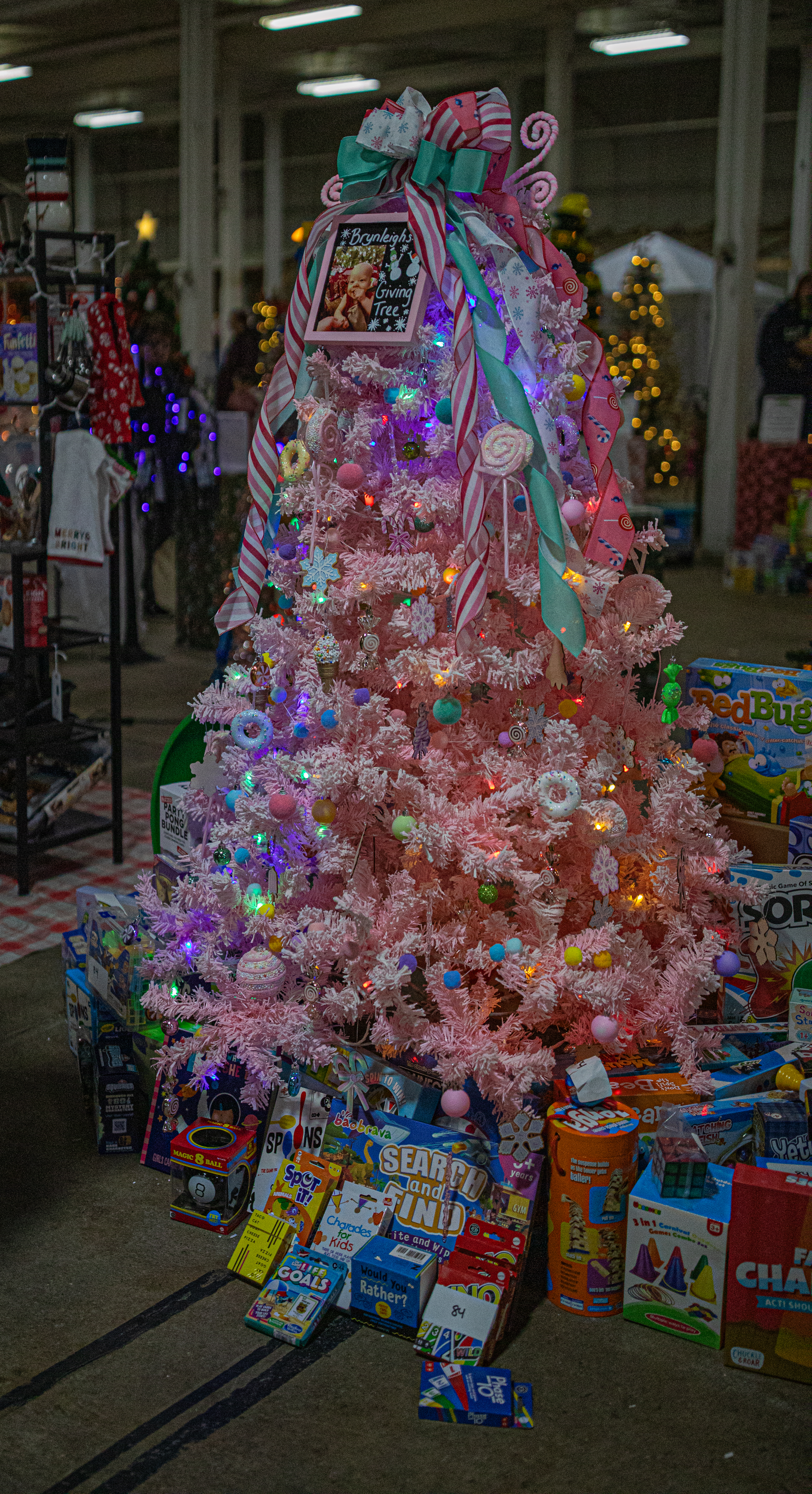 This tree, and “upside down Christmas Tree” had toy trucks and games under (or above?) it.