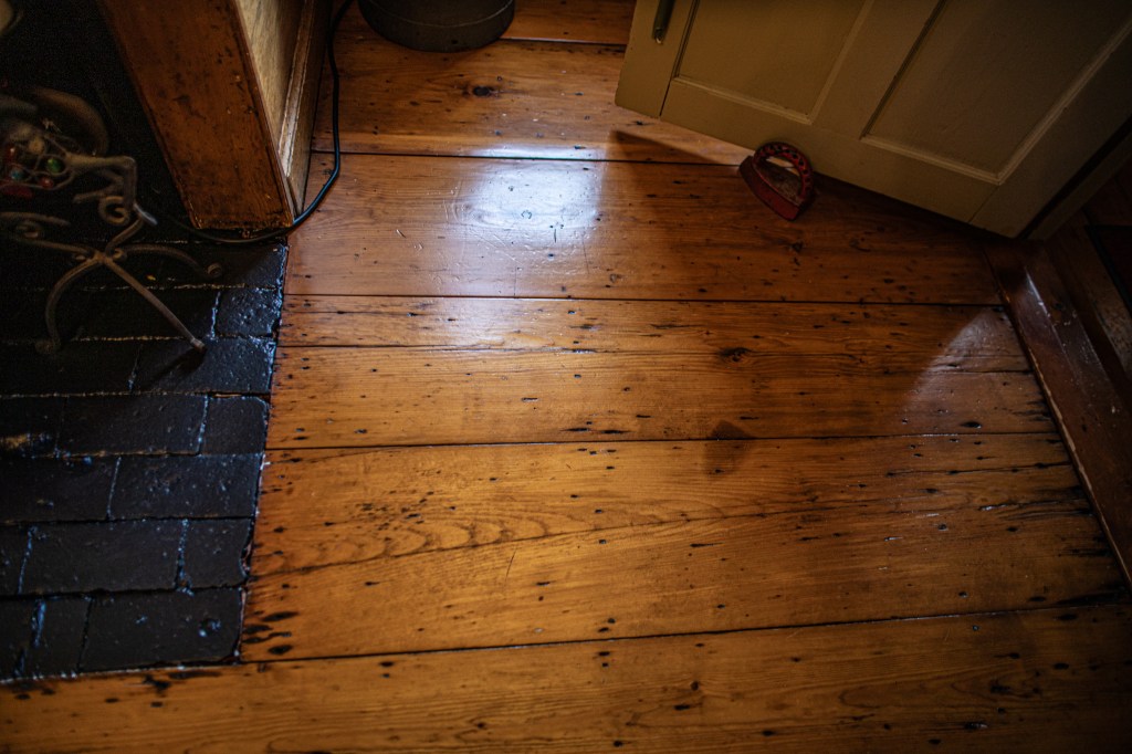 The home still has its original floors in the fireplace area.