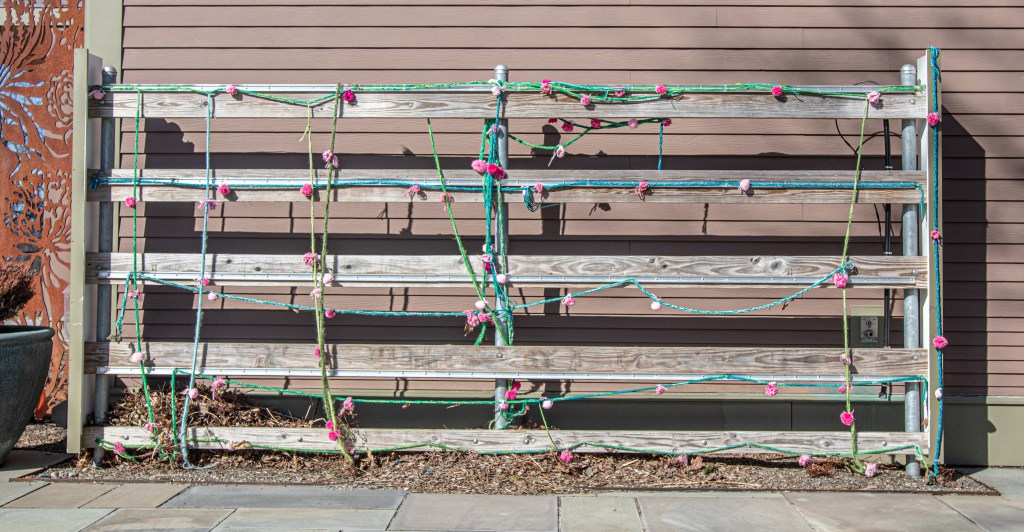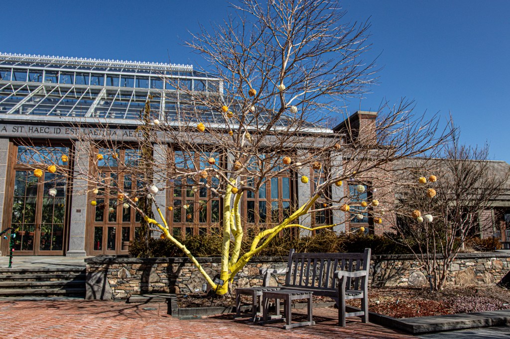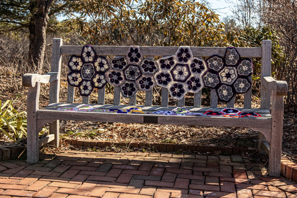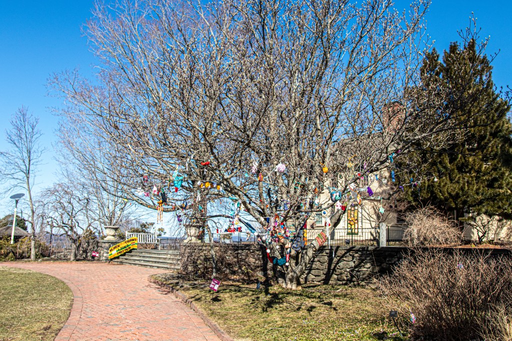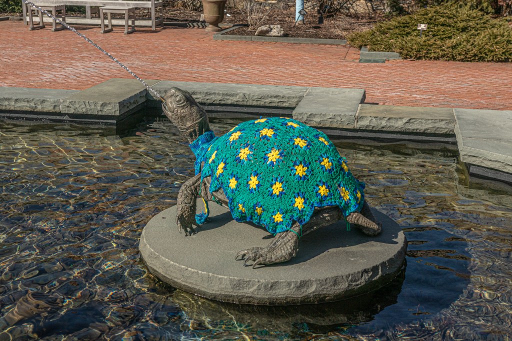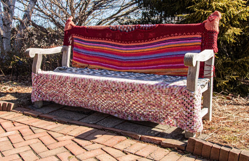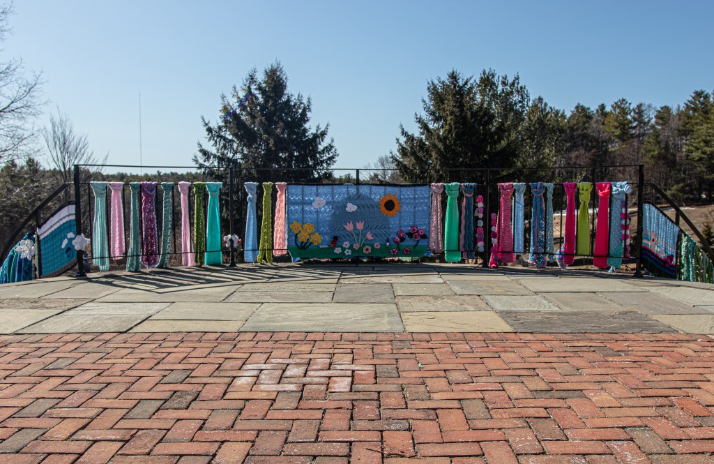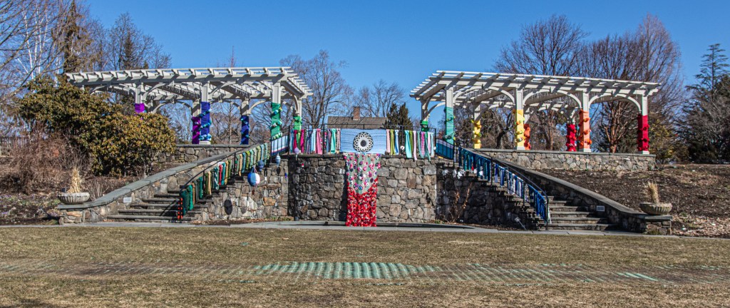 New England is known for its stormy weather. But, there was a very different kind of storm at Tower Hill gardens. Yarnstorming, often referred to as “graffiti knitting” or “yarn bombing” is an art form that uses knitted and crocheted yarn as art instead of paint or water colors.