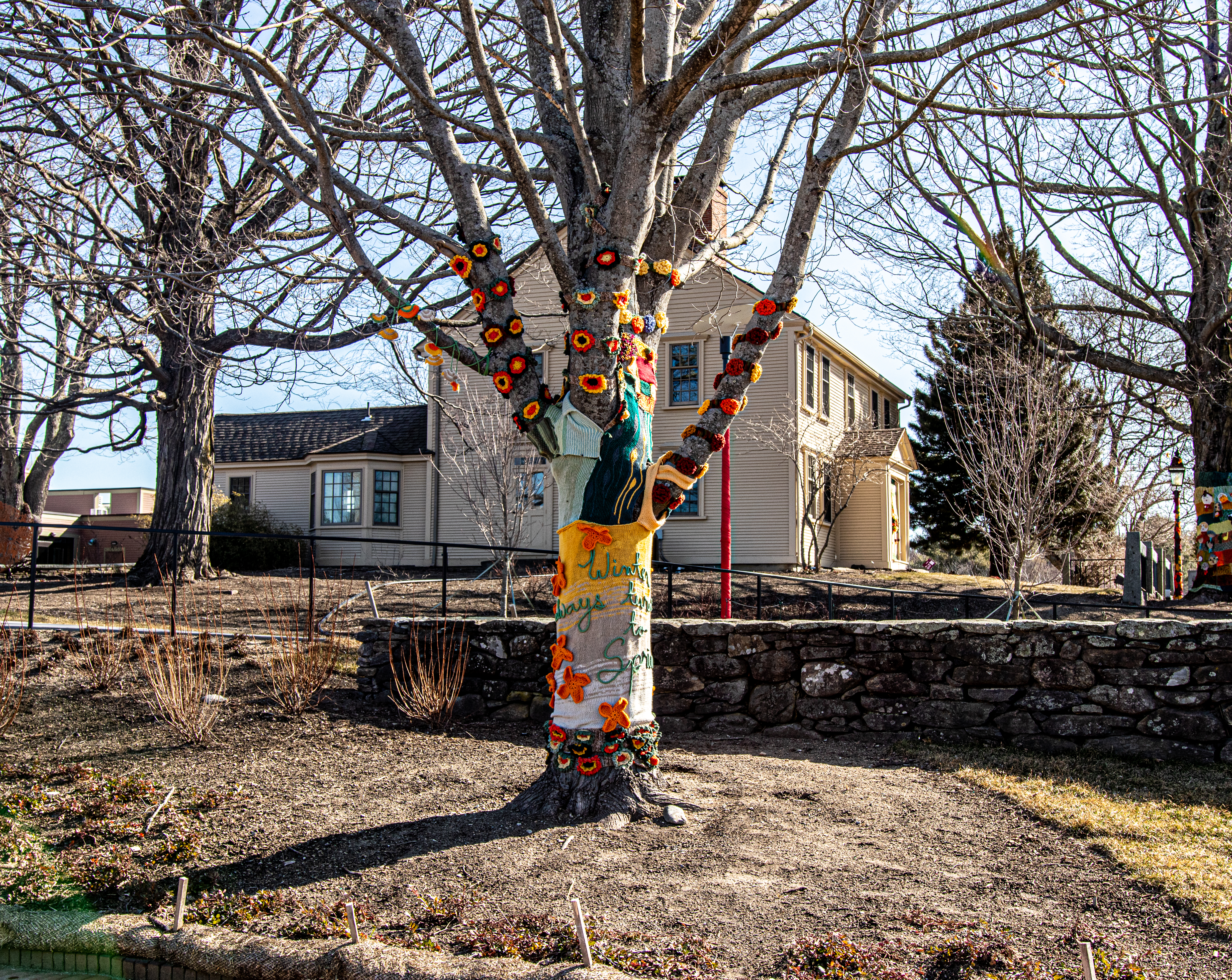 New England is known for its stormy weather. But, there was a very different kind of storm at Tower Hill gardens. Yarnstorming, often referred to as “graffiti knitting” or “yarn bombing” is an art form that uses knitted and crocheted yarn as art instead of paint or water colors.